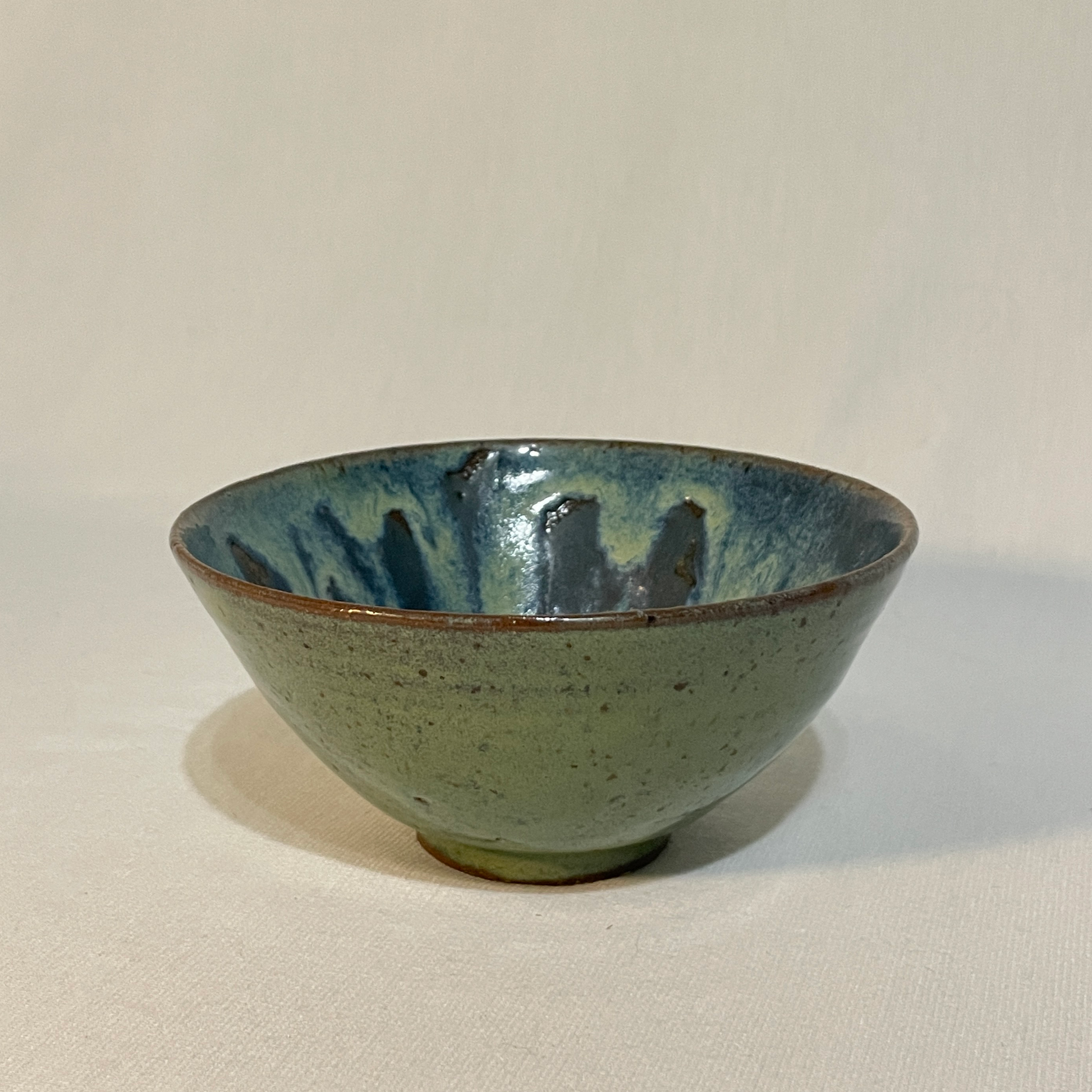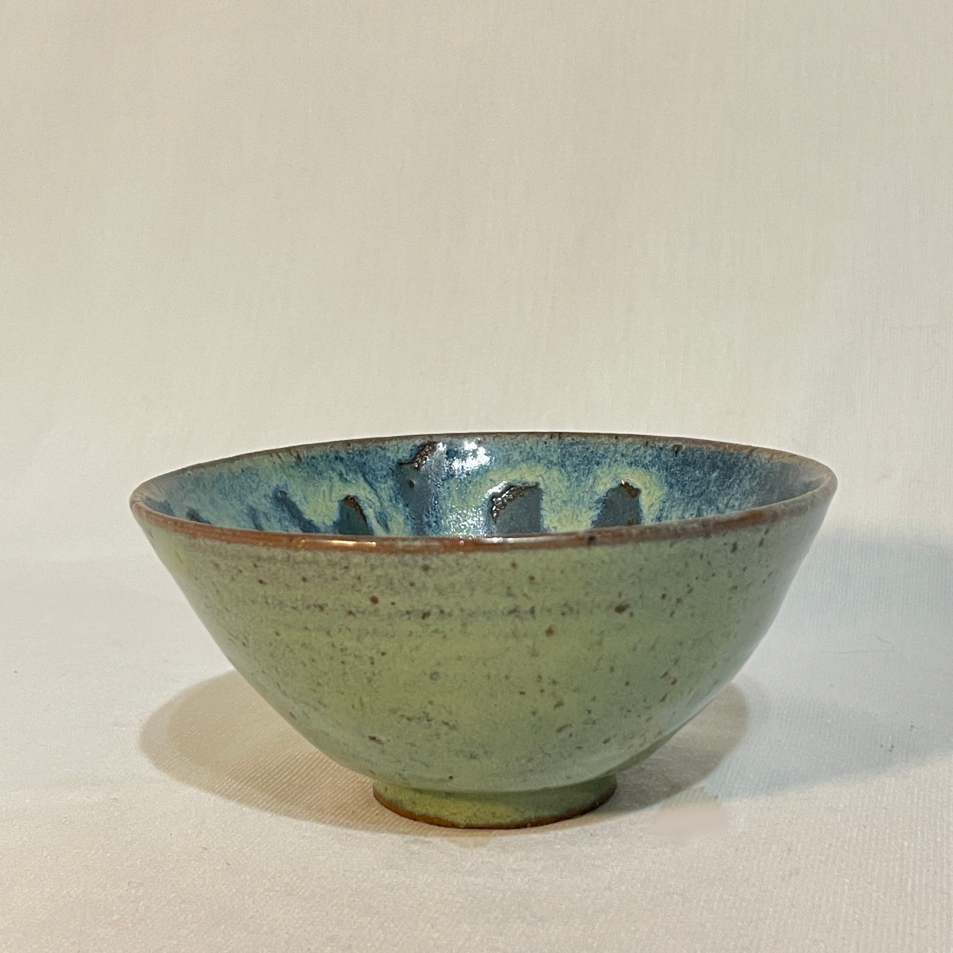 A small bowl with a rutile green and blue glaze.